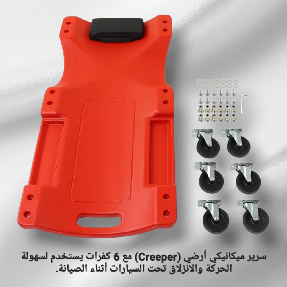 هذه أداة سرير ميكانيكي أرضي (Creeper) تُستخدم لسهولة الحركة والانزلاق تحت السيارات أثناء الصيانة.